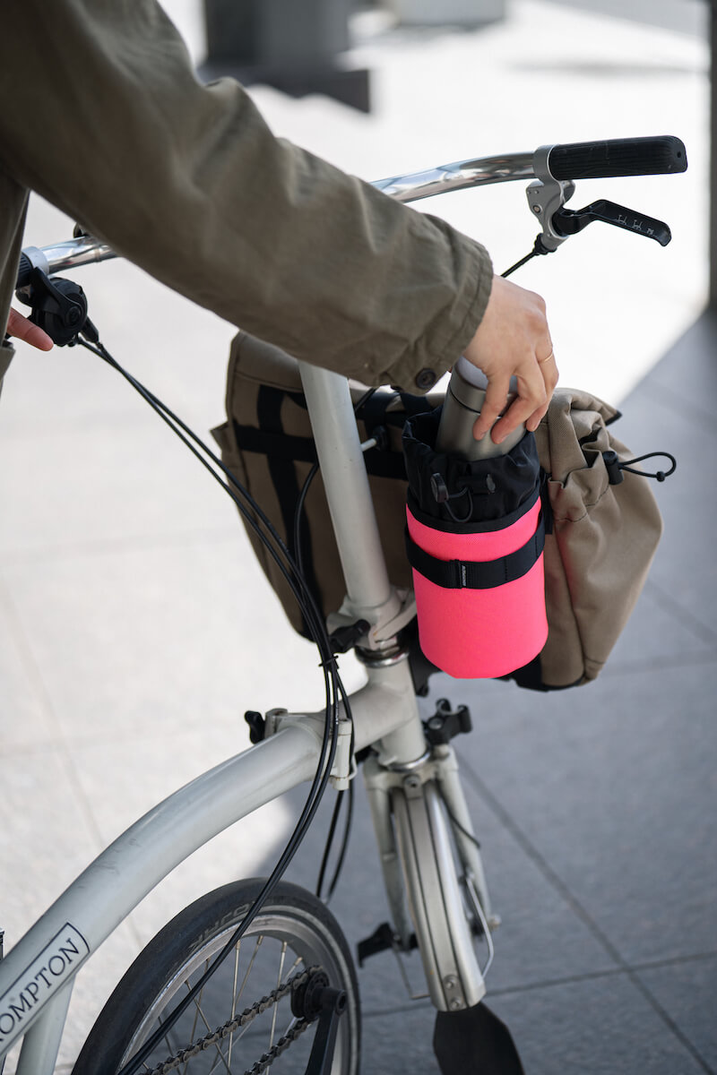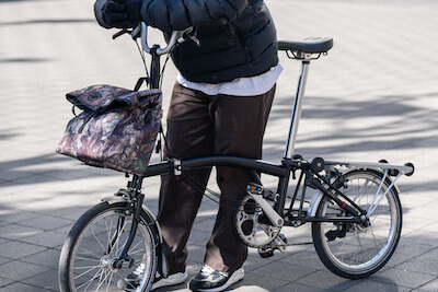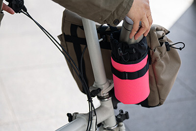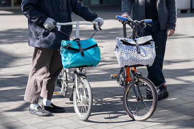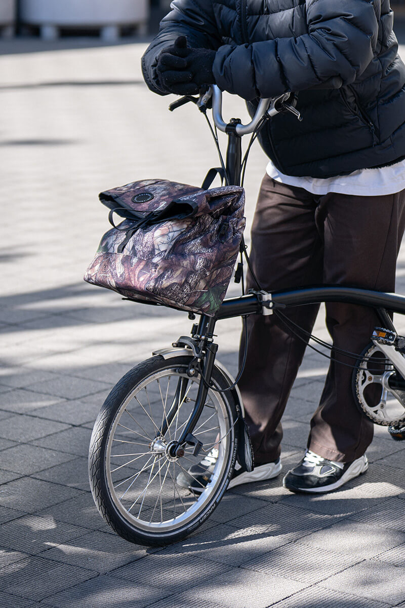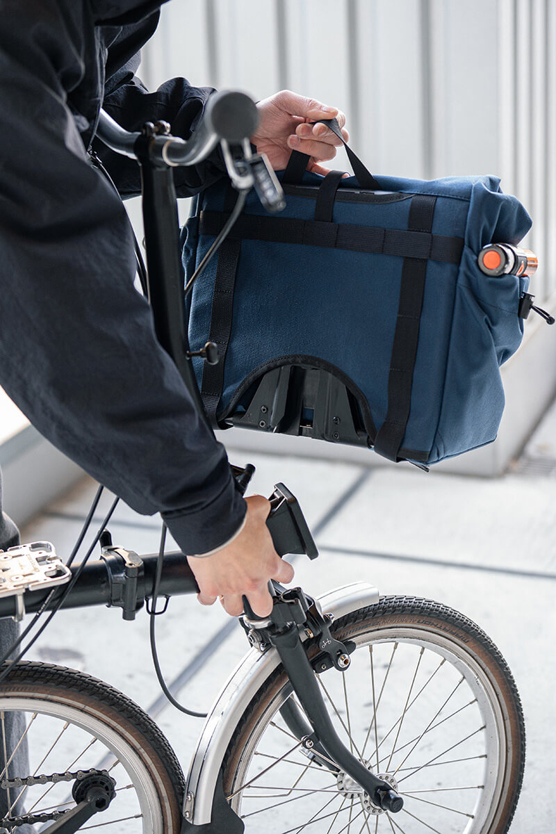 While the original BROMPTON BAG can contain 20-28L, this BROMPTON BAG MINI can 15-20L. Instead of the frame with handle, the MINI bag features 20mm cotton tape handle so that the bag is now more compatible for many bikes.