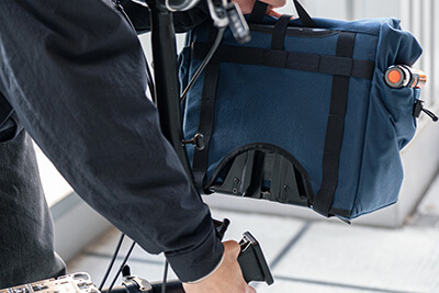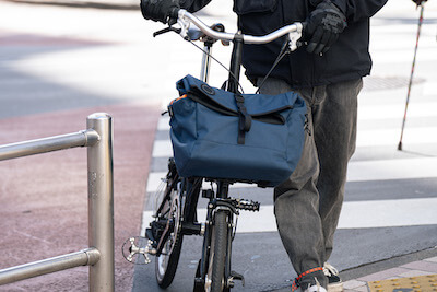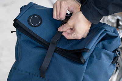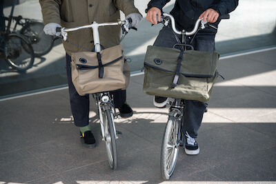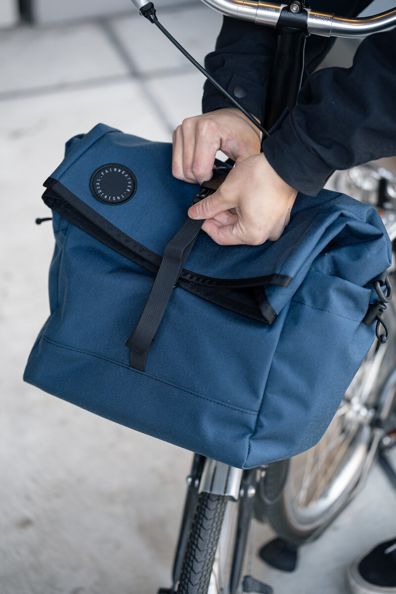 This is our resized version of the BROMPTON BAG. Tough and durable CORDURA1000 for its outer for your daily use. The water proof film laminated rip-stop nylon for the inner so even if the outer got wet its main compartment could remain dry.