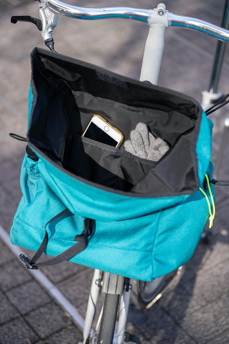 The bag was designed as simple as possible, for the bag to used like a front basket. Two pockets on the sides and two more pockets inside, The pockets on the side can be tighntened with shock cords.