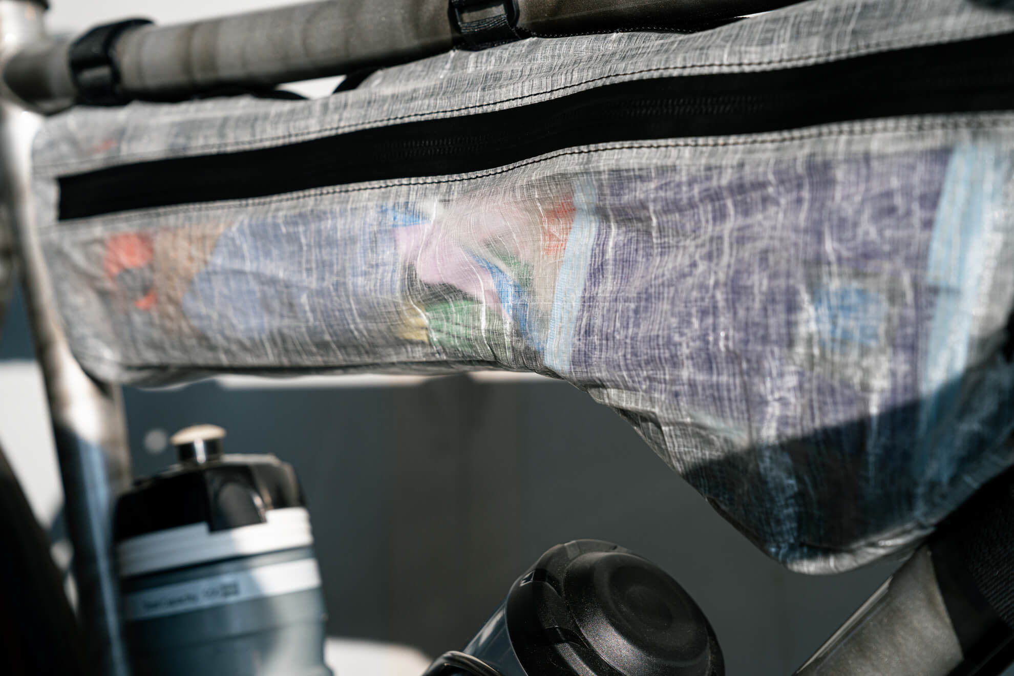 The New Frame Bag SP is available in Dyneema or Cordura fabric. The bag came out as a Super Professional (SP) bag for touring, gravel rides and more tough rides.