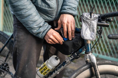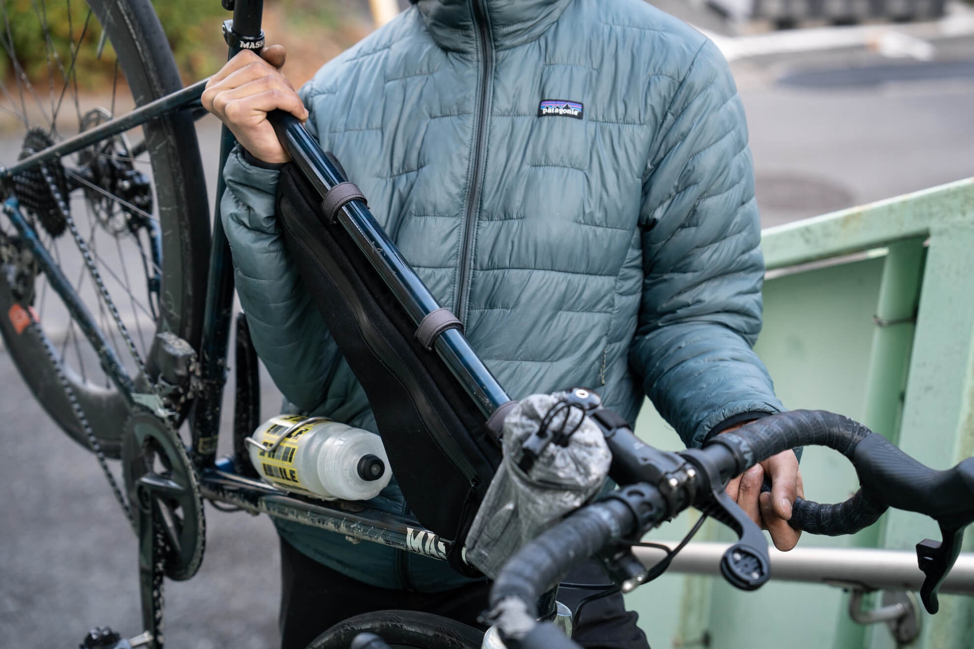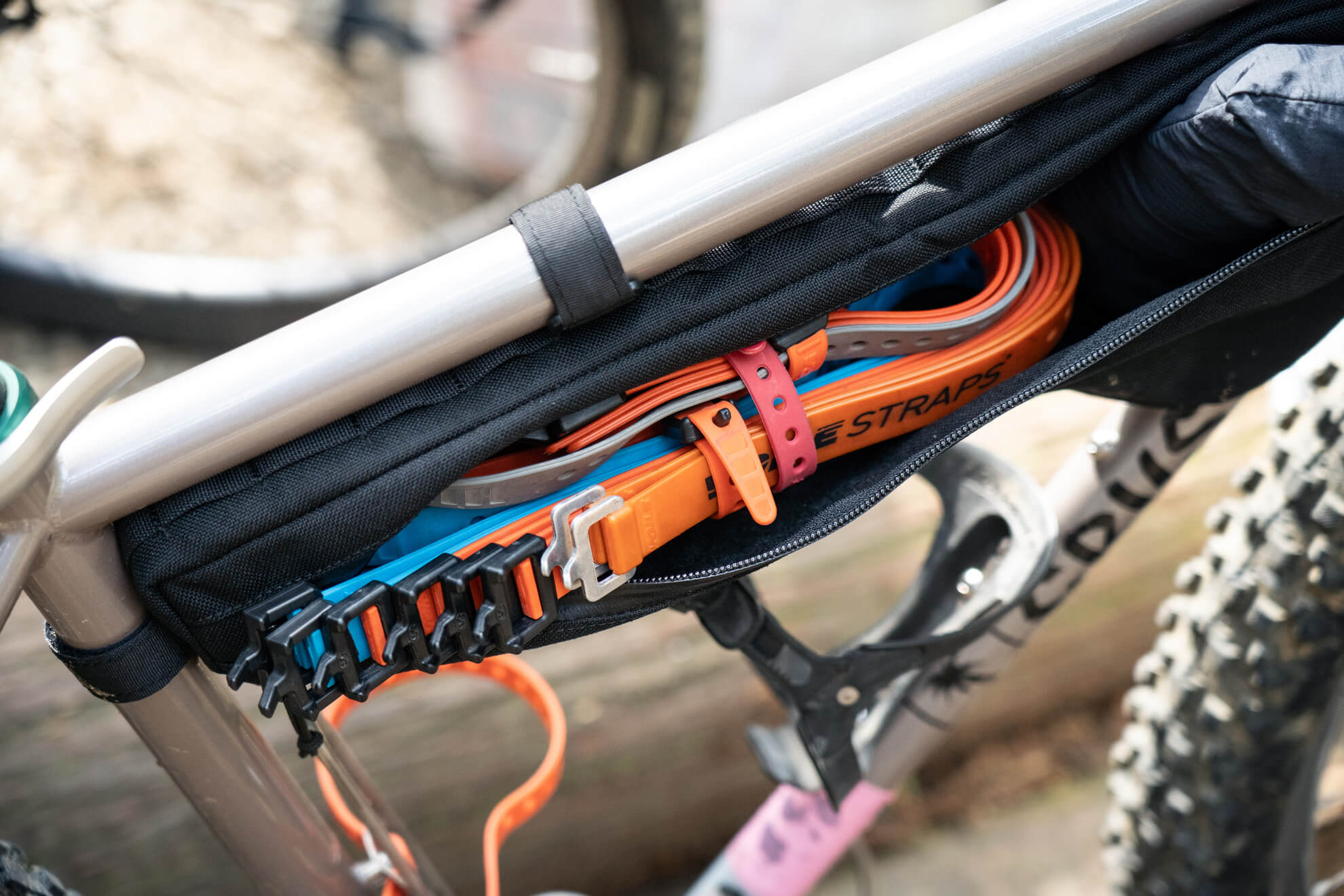 A little hack if you ride a large frame; You can choose a smaller size frame bag to secure a small gab for grabbing the top tube.